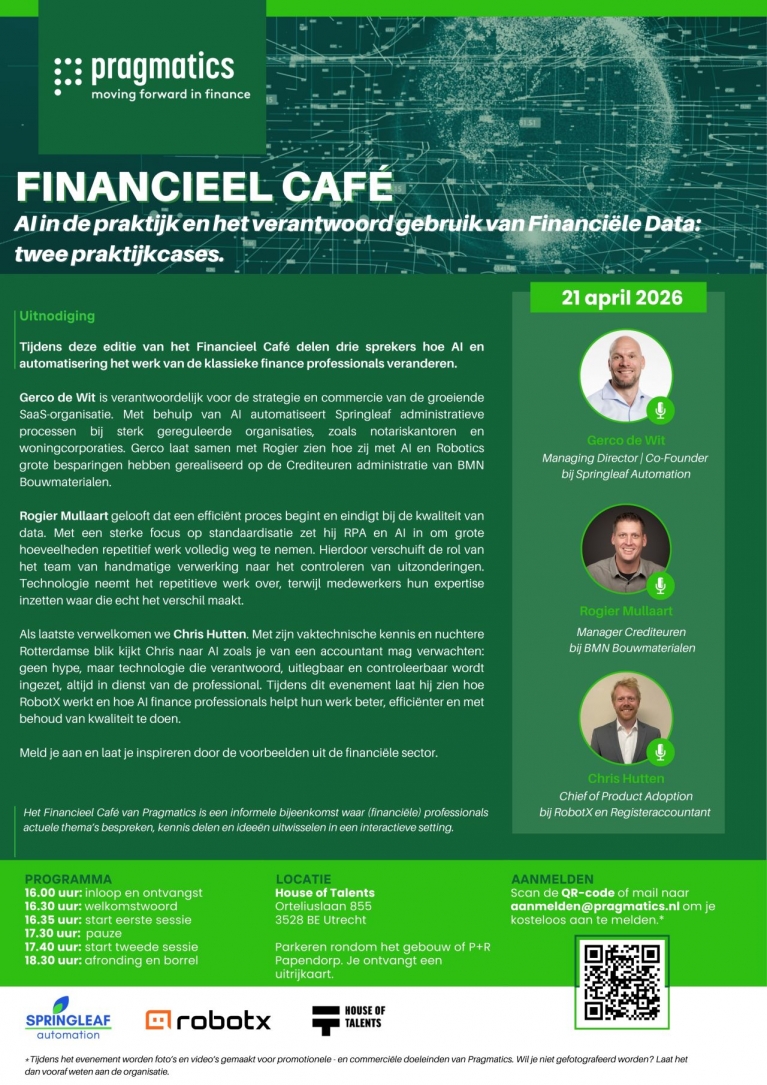 Het Financieel Café biedt daarnaast volop gelegenheid om ervaringen uit te wisselen en je netwerk uit te breiden in een informele setting. Aanmelden kan via onderstaande QR-code of via aanmelden@pragmatics.nl